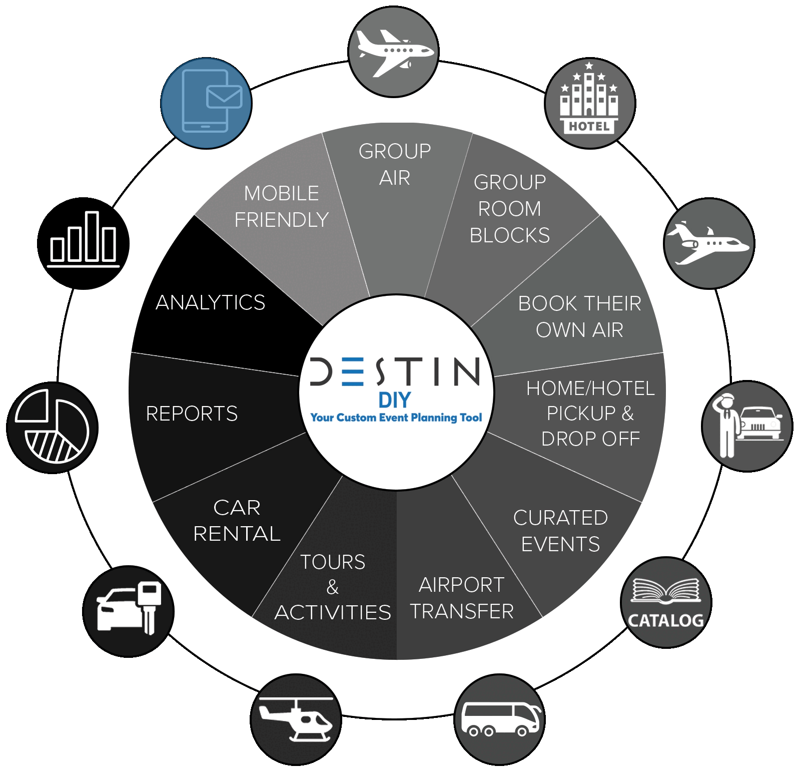 DestinDIY helps planners create a branded event catalog and supports planners with tools for client customization, booking management, and communication. A dedicated success manager provides marketing guidance, and all essential staff have full access for seamless event coordination.